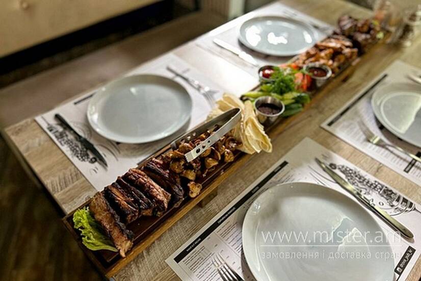 Шашлик, ребра, крильця, помідор, огірок, гриби гриль, соуси, лаваш.