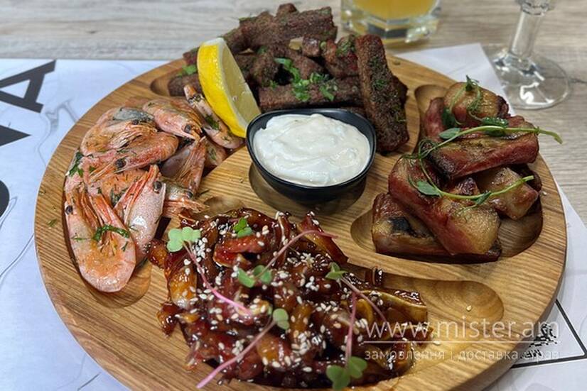 Ребра копчені, вушка унагі, смажені креветки, грінки з часничком, соус.