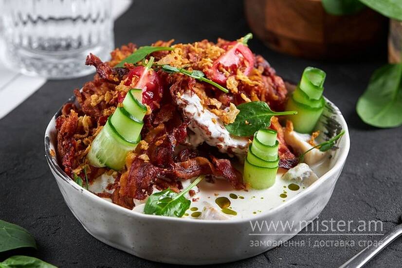 Деруни з беконом та вершковим соусом з грибами