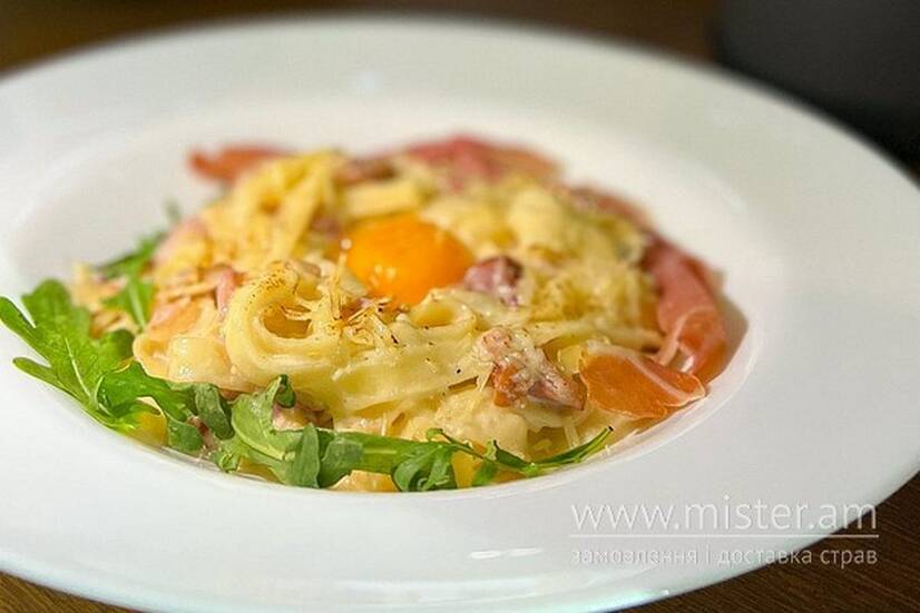Гарячі страви: Бефстроганов з вершковим картопляним пюре, Камамбер з карамелізованими яблуками та ягідним кюлі, Медальйони з телятини під соусом Дор Блю, Мідії в вершковому соусі, Качина ніжка конфі з вершковим картопляним пюре, Філе телятини з пюре з зеленого горошку, Деруни з сьомгою та соусом голандез, Стейк з телятини (за 100 г), Деруни з беконом та вершковим соусом з грибами, Фірмові реберця, Паста Nero з телятиною, Паста Verde з дарами моря