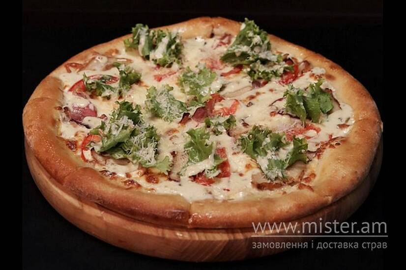 Курочка, бекон, лист салату, моцарела, пармезан, томати, вершки, соус "Цезар".