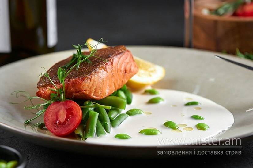 Стейк сьомги зі спаржею та вершковим соусом
