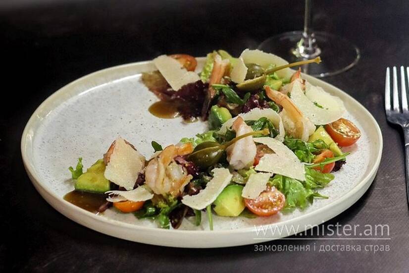 Хвости тигрових креветок, рукола, мікс салата, томати чері, плоди каперсів, пармезан, соус.