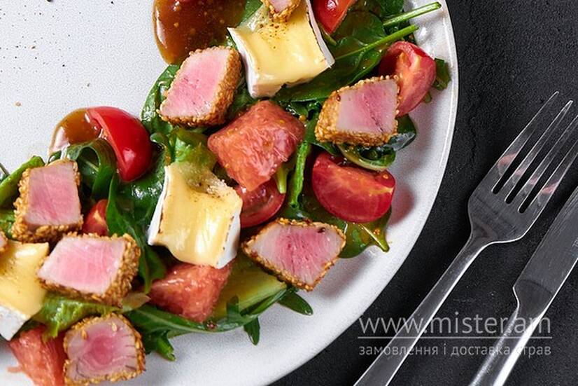 Тунець, грейпфрут, сир брі, рукола, мікс салату, томати чері, соус.