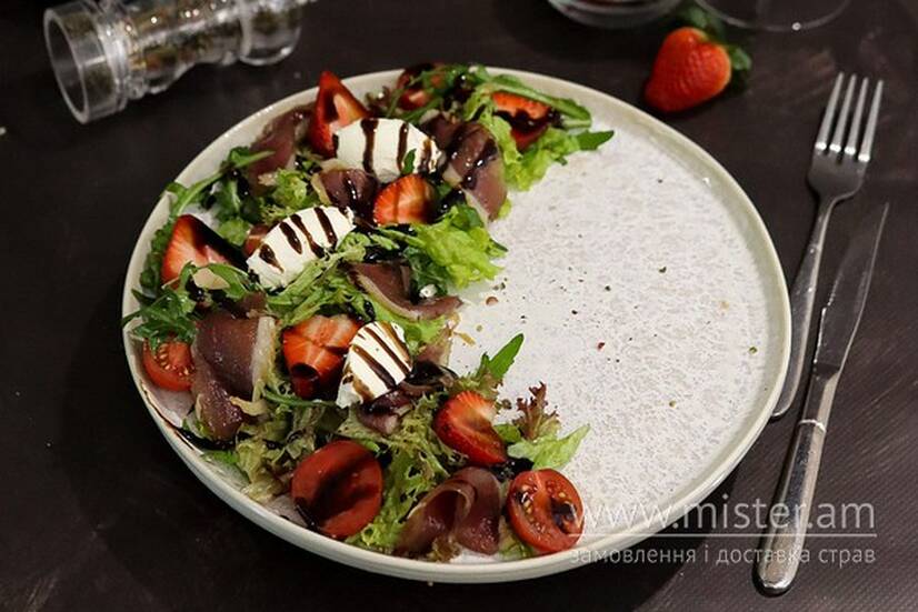 Прошуто, виноград, крем-сир, томати чері, мікс салату, рукола, соус.