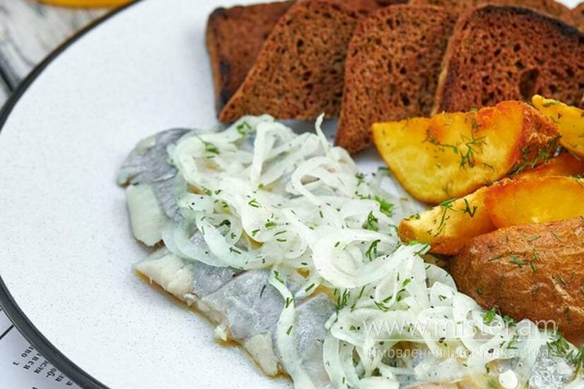 Оселедець з цибулею, картоплею та грінкам