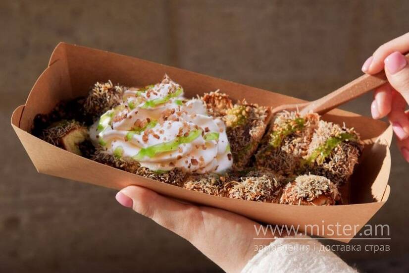 Кюртош дубайський шоколад з крем-чіз - поєднання насиченого шоколаду, солодкої фісташкової пасти та хрусткого тіста створює багату смакову палітру, а ніжний крем-чіз додає домашнього затишку.