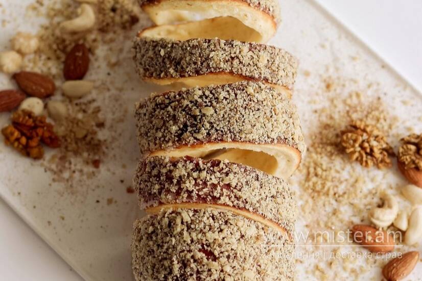 Кюртош з грецьким горіхом — для шанувальників насиченого горіхового смаку: ароматна скоринка, щедро обсипана подрібненими волоськими горіхами, дарує глибокі вершкові ноти й ідеальний хрускіт у кожному шматочку!