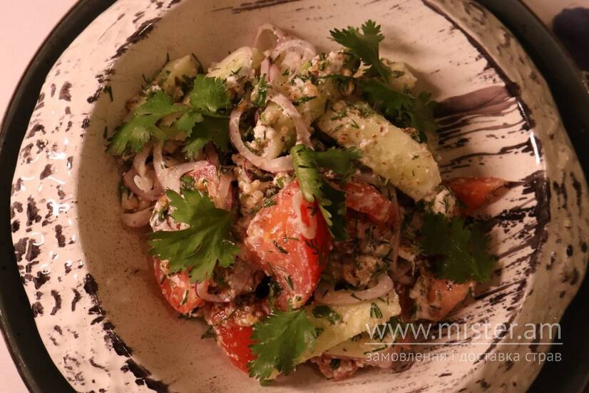 Салат з томатів та огірків із заправкою з волоських горіхів