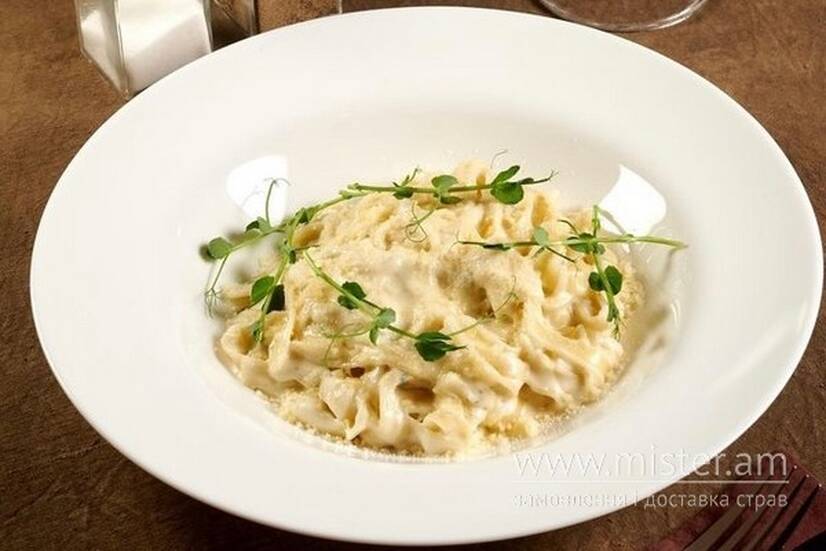 Спагеті, сир Моцарелла, сир Пармезан, сир Дор Блю, вершки, мікрогрін.