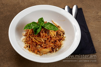 Спагетті, соус Болоньєзе, сир Пармезан.