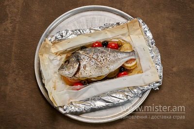 Дорадо, помідор чері, кабачок, перець болгарський, лимон, розмарин.