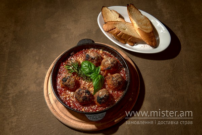 Фарш Польпетте, соус Пелаті, печериці, перець солодкий, перець халопеньйо, розмарин, пармезан, багет.