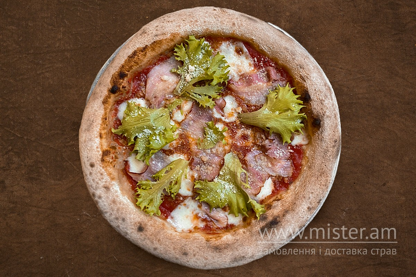 Неаполітанське тісто, фарш Болоньезе, соус Пелаті. мікс салатів, сир Моцарела, бекон, сир Пармезан, зелена олія.