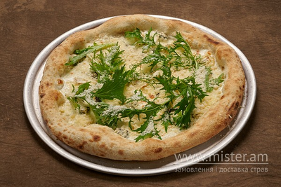 Неополітанське тісто, вершки, сир Моцарела, сир Брі, сир Дор Блю, сир козиний Кроттен, сир Пармезан, мікс салатів, спайсі мед.