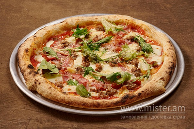 Неополітанське тісто, соус Болоньєзе, сир Моцарела, бекон, пармезан, мікс салатів.