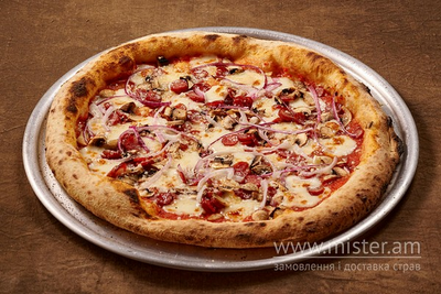 Неополітанське тісто, соус Пелаті, сир Моцарела, печериці, кабаноси, цибуля синя, сир Пармезан.