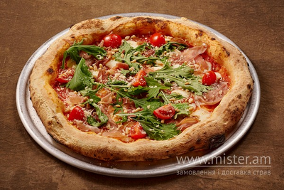 Неополітанське тісто, соус Пелаті, сир моцарелла, прошуто крудо, рукола, фісташка, пармезан, помідор чері.