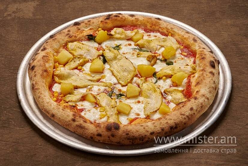 Неополітанське тісто, соус Пелаті, сир Моцарелла, ананас, кукурудза, мариноване куряче філе, сир Пармезан.