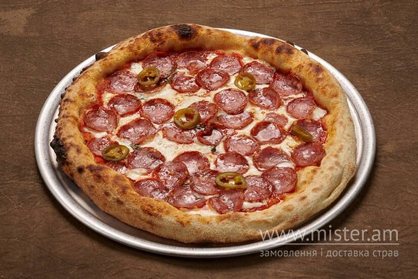 Неополітанське тісто, соус Пелаті, сир Моцарелла, салямі, сир Пармезан, перець халопеньо.