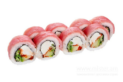 Норі, рис, крем-сир, огірок свіжий, тунець, авокадо.