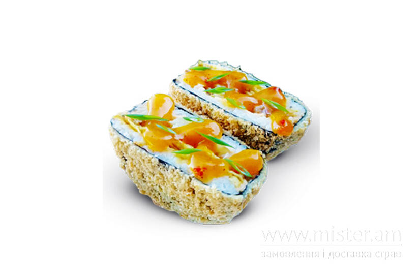 Рис, курка, сир Дор блю, ананас, японський майонез, сир чедр, соус манго, зелена цибуля.