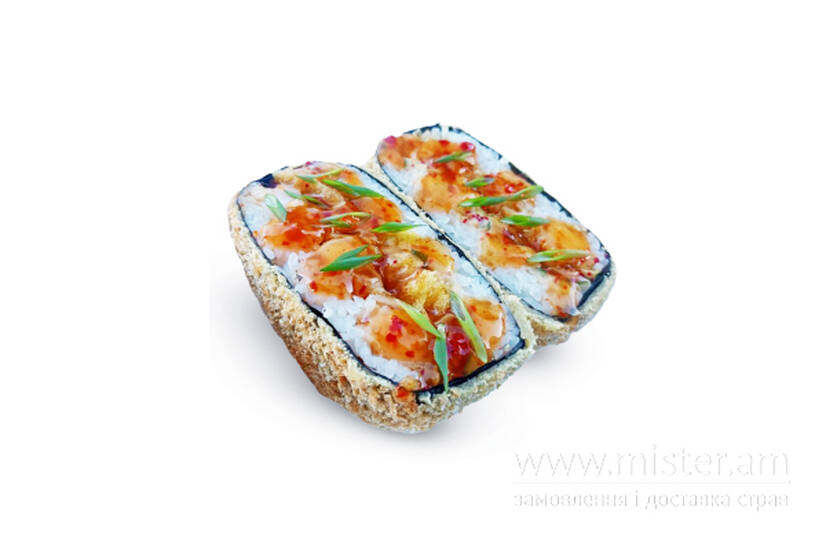 Рис, норі, огірок, чедр, япоснький майонез, тобіко, сніжний краб, креветка темпура, чіпси, сухарі панко, соус свід чілі.