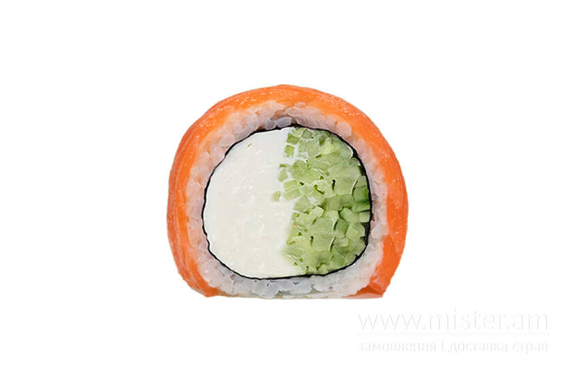 Рис, норі, крем-сир, огірок, лосось копчений.