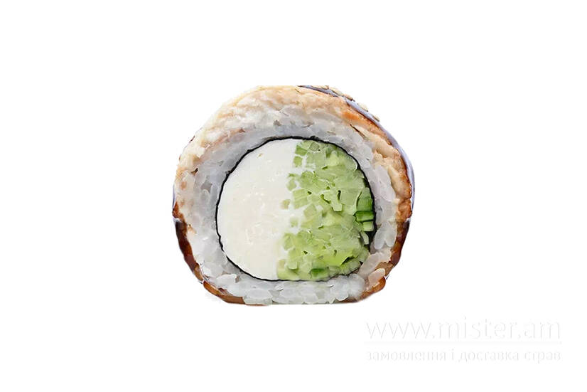 Рис, норі, крем-сир, огірок, вугор, унагі соус, кунжут.