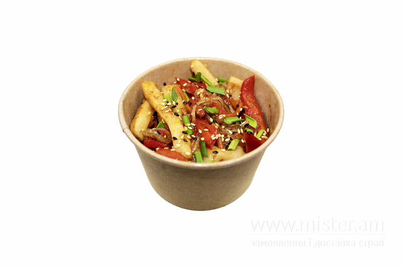 Кальмар, фунчоза, перець болгарский, морква, імбир, часник, цибуля ріпчата, соус світ, кунжут, зелена цибуля.
