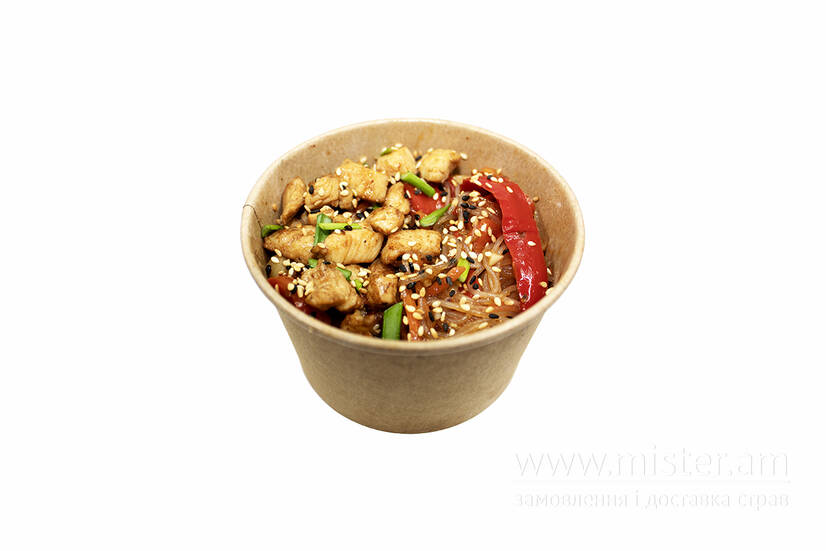 Курча, фунчоза, перець болгарский, морква, імбир, часник, цибуля ріпчата, соус світ, кунжут, зелена цибуля.