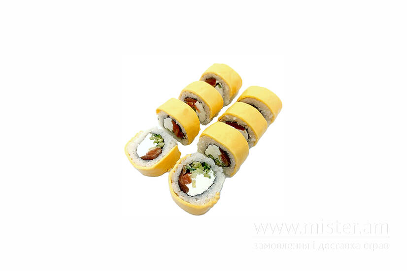 Рис, норі, крем-сир, огірок, сир чеддер, лосось копчений.