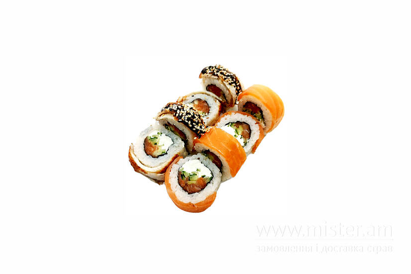 Рис, норі, крем-сир, огірок, лосось, вугор, лосось копчений.