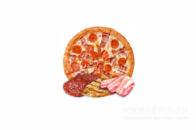 Томатний соус, курча, салямі, бекон, сир моцарелла.