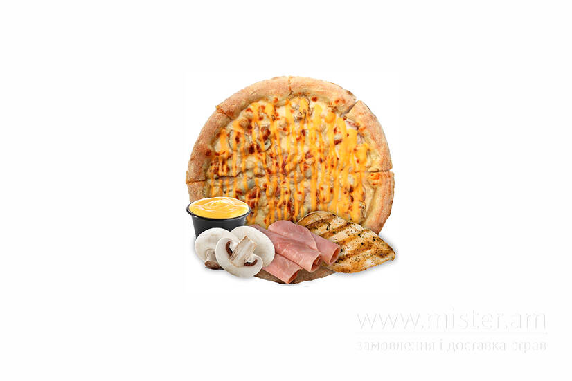 Білий соус, печериці, курча, шинка, соус чедр, сир моцарелла.