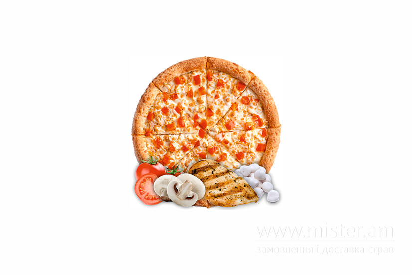 Томатний соус, курча, томати, печериці, сир моцарелла.