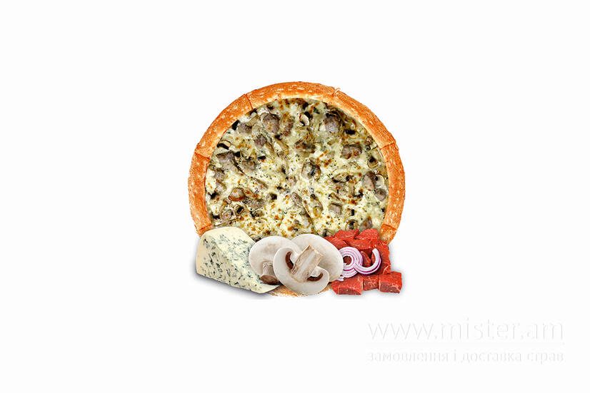 Білий соус, свинина, печериці, цибуля, сир Дор Блю, сир моцарелла.