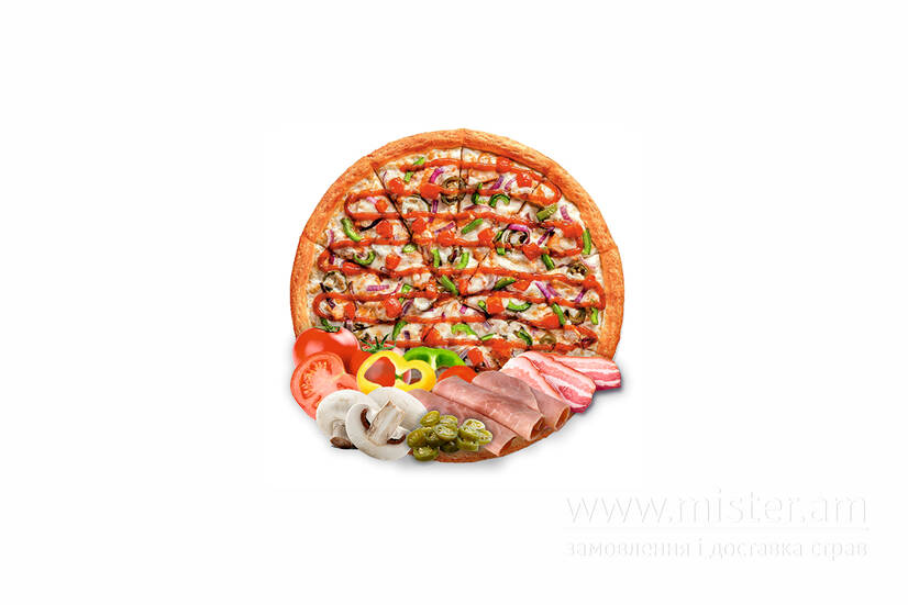 Томатний соус, світ чилі, шинка, печериці, томати, бекон, перець болгарський, халопенью, сир моцарелла.
