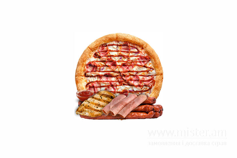 Томатний соус, шинка, курча, кабаноси, сир моцарелла, соус BBQ.