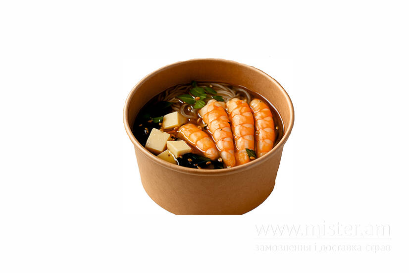 Креветка, місо бульйон, водорості вакаме, локшина, сир Тофу, цибуля зелена, кунжут.
