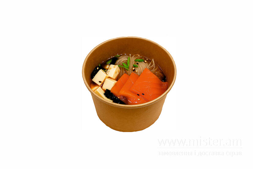 Лосось, місо бульйон, водорості вакаме, локшина, сир Тофу, цибуля зелена, кунжут.