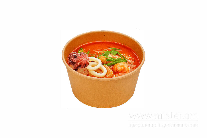 Креветка, кальмар, восьминіг, кокосове молоко, паста том ям, імбир, часник, цибуля червона, рис, черрі, лимон, кунжут, зелена цибуля.