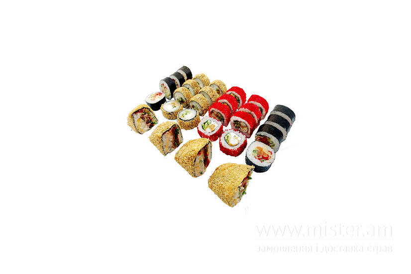 Каліфорнія в ікрі креветка темпура, міні бургер тунець, хот рол курка дор блю, футо макі лосось тобіка. 32 шт.