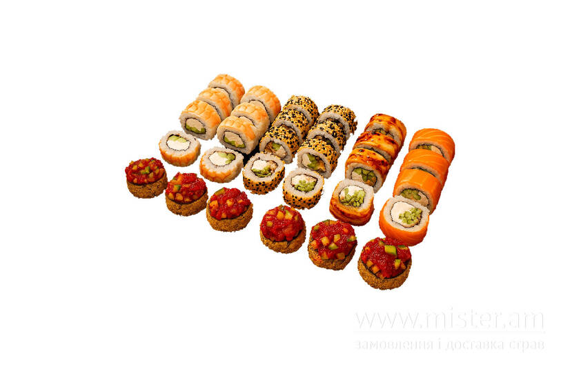 Філадельфія лосось копч., Філадельфія унагі креветка, Філадельфія лосось/вугор, хот рол лосось/авокадо. 30 шт.