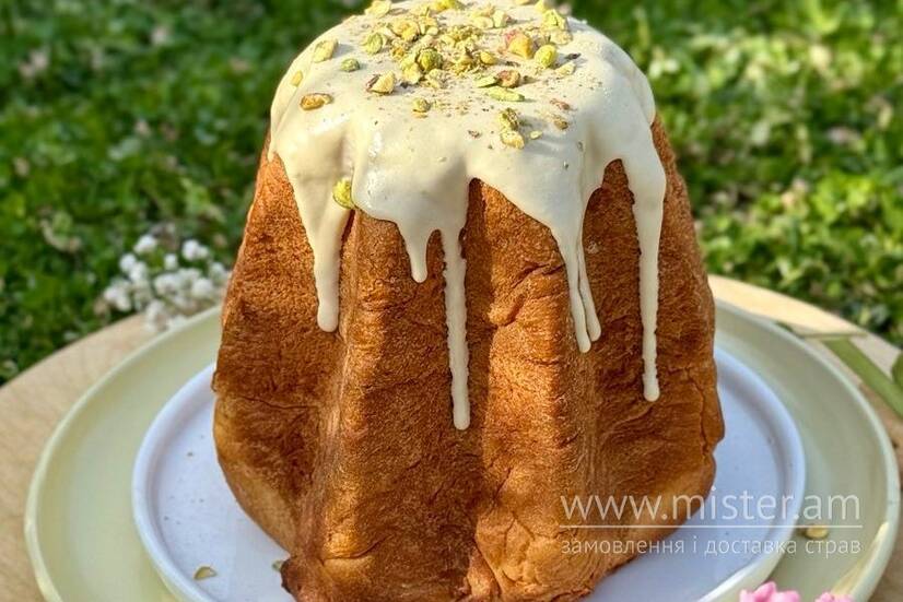 Пухке дріжджове тісто, а в середині -ніжний крем з білого шоколаду, вершків та фісташкової пасти. Зверху - декорований фісташковою пастою з білим шоколадом та фісташкою. Великодній десерт, що здивує навіть найвибагливіших гурманів.