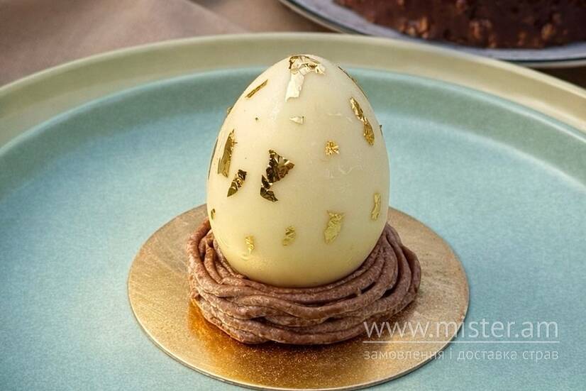 Мус на основі білого шоколаду, в середині абрикосовий джем, покриття білий шоколад, зефірне гніздо.
