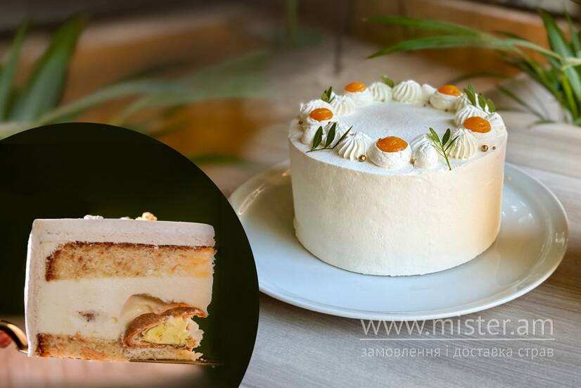 Ніжний білий бісквіт з апельсиновим просоченням, мус на основі Маскарпоне та білого вина. Всередині профітролі з апельсиновим кремом.
