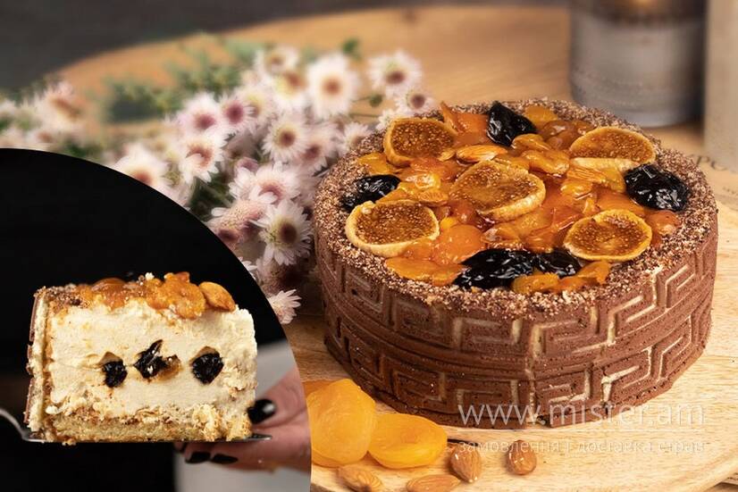 Тонкий ніжний білий бісквіт, повітряне суфле на основі сиру Філадельфія з додаванням сухофруктів (курага, інжир, чорнослив) та лікеру Амаретто.