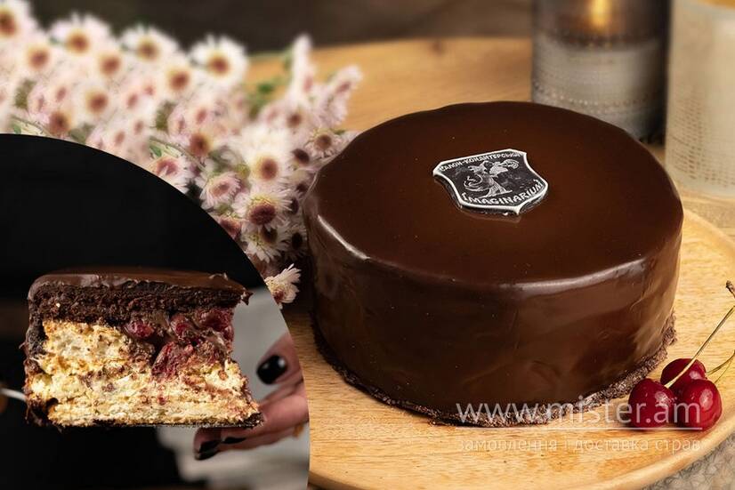 Шоколадний бісквіт просочений Амаретто, хрумка горіхова меренга з фундуком, свіжа вишня, повітряний крем на основі сиру Маскарпоне. Залитий глазур`ю з натурального шоколаду.
