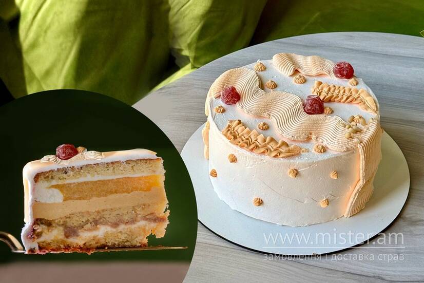 Обліпиховий бісквіт, пропитаний обліпиховим сиропом, апельсинове компоте, обліпиховий мус, збита карамель із кедровим горіхом, апельсиновий вершково-сирний крем.